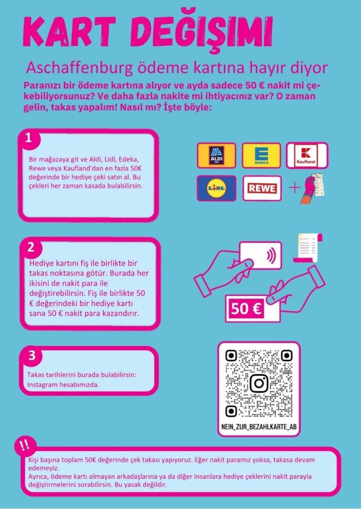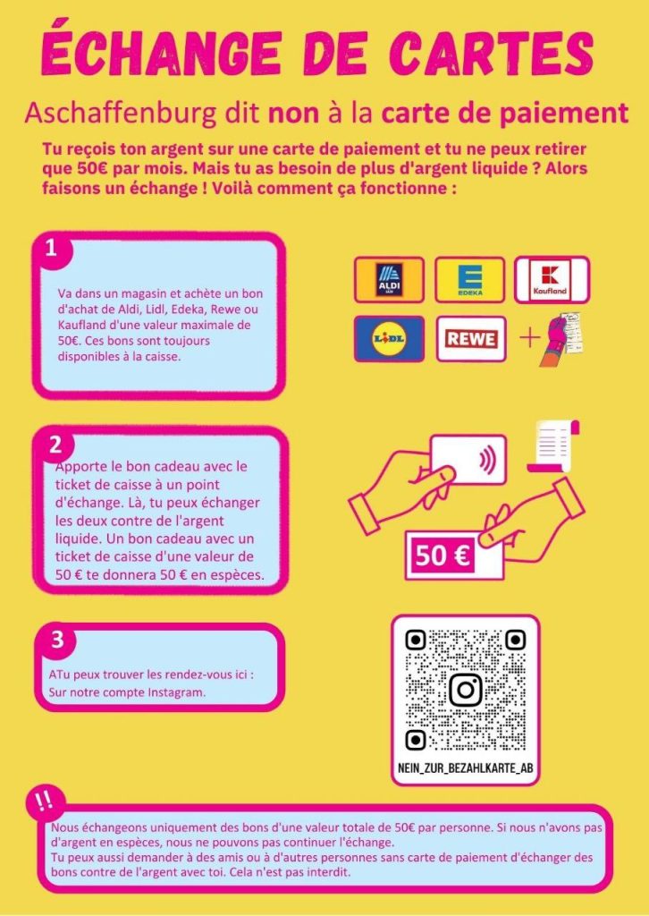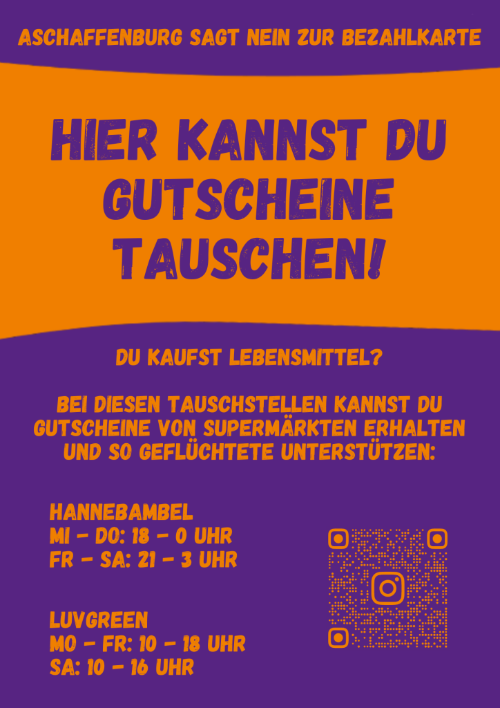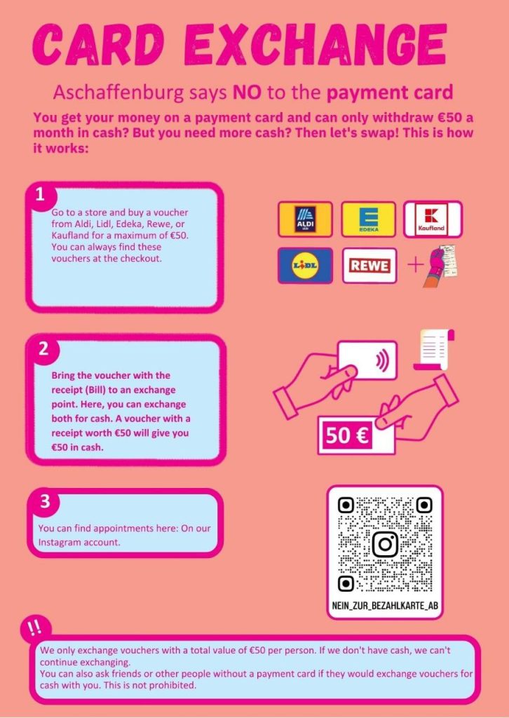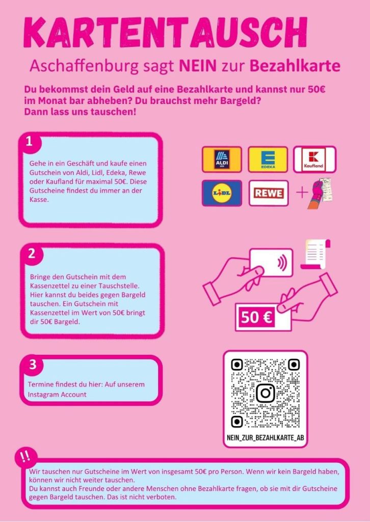 Kaufe mit deiner Bezahlkarte einen 50€ Geschenk-Gutschein und bringe ihn zu einer unserer Tauschaktionen. Dort bekommst du dann pro Gutschein 50€ Bargeld.