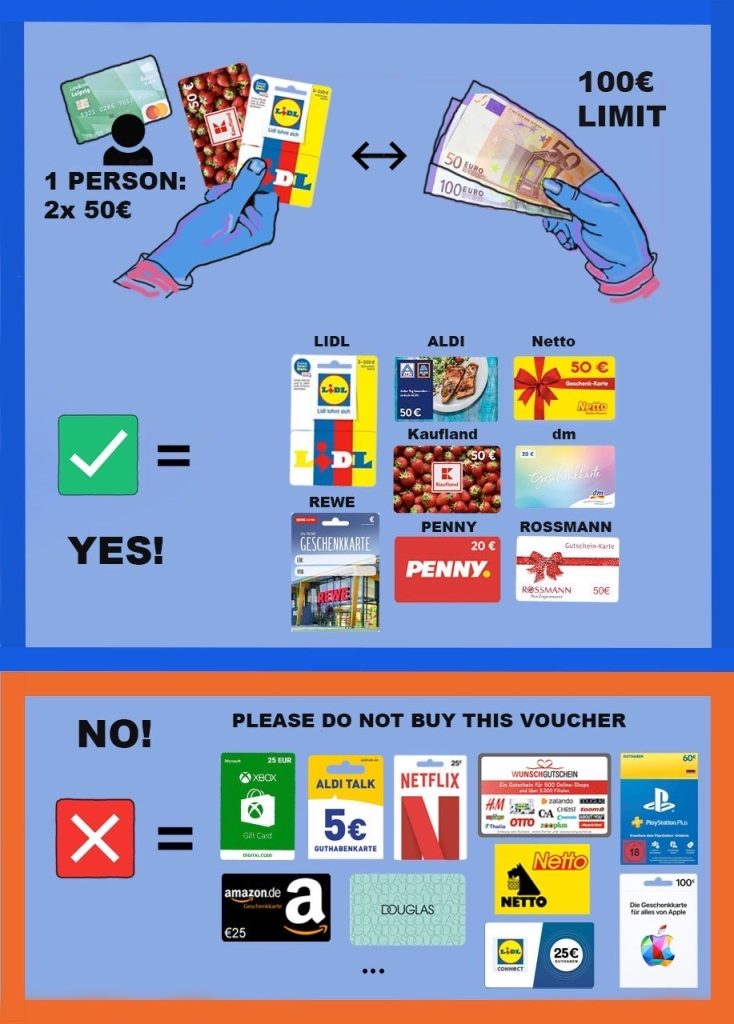 Kaufe mit deiner Bezahlkarte einen oder zwei 50€ Geschenk-Gutscheine und bringe sie zu einer unserer Tauschstationen. Dort bekommst du dann pro Gutschein 50€ Bargeld. Pro Person können maximal 100€ getauscht werden.